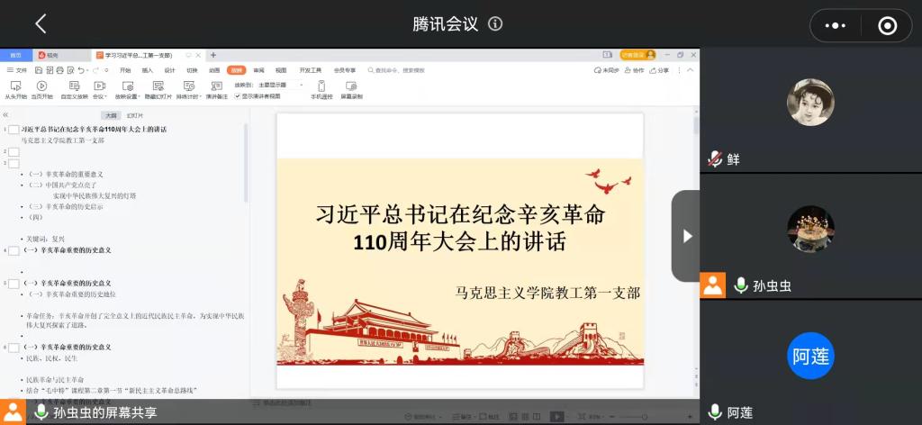 金秋十月,习近平总书记在纪念辛亥革命110周年大会上发表了重要讲话,马克思主义学院教工第一党支部在腾讯会议上开展组织生活会,深入学习习近平总书记重要讲话精神,会议由第一党支部书记孙莎岚主持。