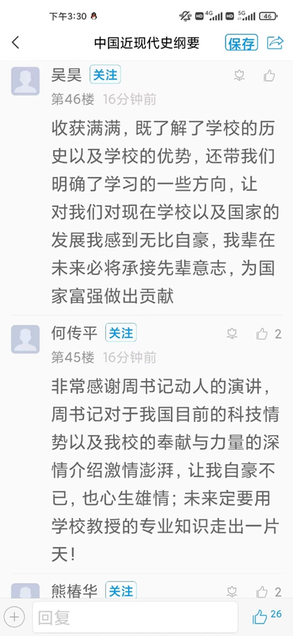 报告结束后,同学们纷纷表示,今天怀着激动的心情来听党委书记讲“开学第一课”,受益匪浅,作为新时代的大学生,将深入学习贯彻党的二十大精神,进一步提升思想理论水平和专业学习能力,为建设中国式现代化贡献青春力量。
