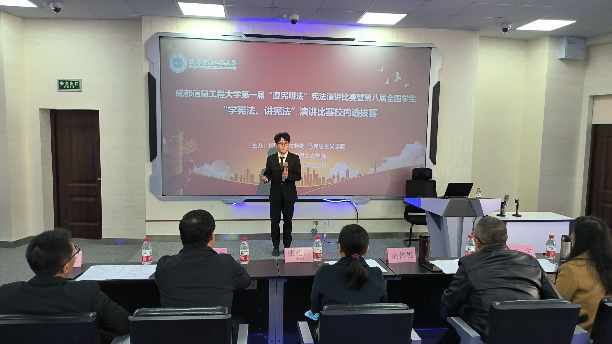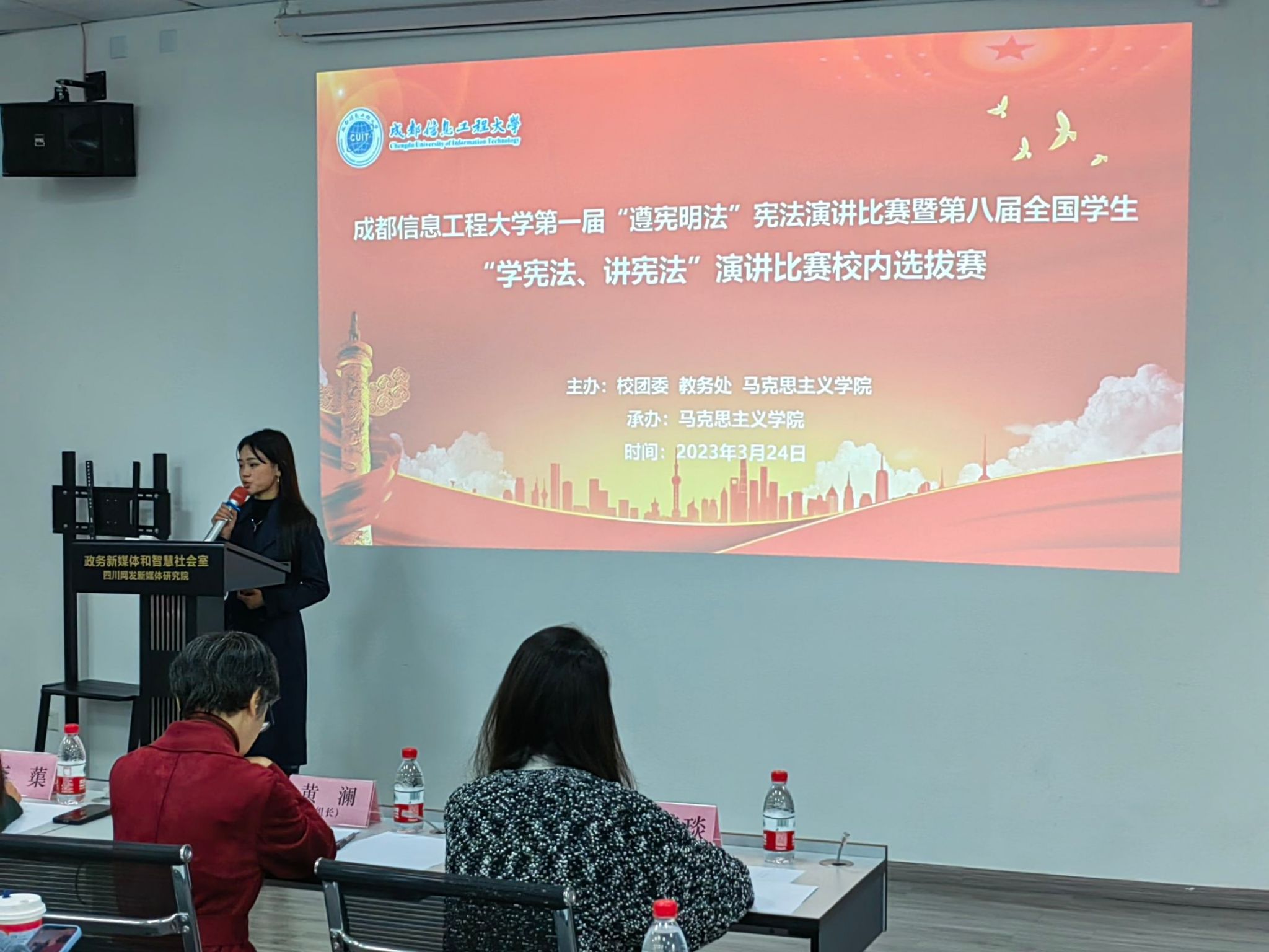 根据学校“一院一赛”大学生综合素质提升规划、全面提升大学生思想道德水平、选拔优秀学生参加全国大学生“学宪法、讲宪法”系列活动等文件精神,2023年3月24日,由校团委、教务处、马克思主义学院主办,马克思主义学院承办的成都信息工程大学第一届“遵宪明法”宪法演讲比赛暨第八届全国大学生“学宪法、讲宪法”演讲比赛校内选拔赛在航空港校区四川省网信人才培养基地(第三教学楼)3201教室、3202教室进行。
