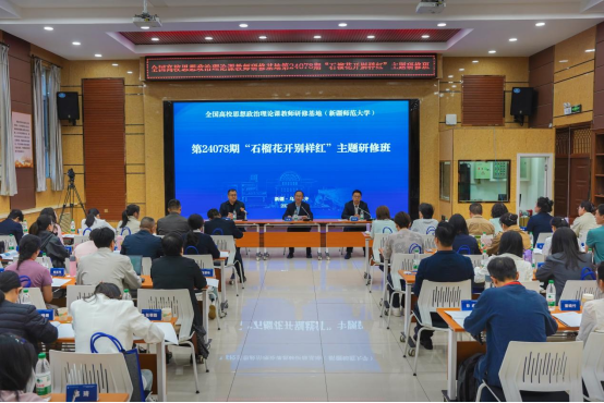 9月24日上午,主题研修班开班式在新疆师范大学温泉校区文汇楼113会议室举行。新疆师范大学党委副书记刘俊出席开班仪式并致辞。他向来自全国的思政课教师表示热烈欢迎,并简要介绍了新疆师范大学的发展历程和新疆经济社会的发展变化,希望全体学员通过所见所闻所思所悟,积累丰富的思政课教学素材,讲好铸牢中华民族共同体意识的“大思政课”,传播好新疆故事。新疆师范大学马克思主义学院党委书记张峥介绍了研修课程设置情况及培训要求。他指出此次培训课程设置了理论教学、现场教学和实践研学等环节,采取专家辅导、集体研学、个案访谈、小组探究等方法,组织开展专题式、任务式、蹲点式学习调研,希望全体学员通过研修深入了解习近平总书记“各民族像石榴籽一样紧紧抱在一起”的理念,深刻体悟习近平新时代中国特色社会主义思想在新疆的生动实践,积累丰富的思政课教学素材和生动案例,推动思政课改革创新和高质量发展。开班仪式由新疆师范大学马克思主义学院党委副书记、纪委书记吴常柏主持。