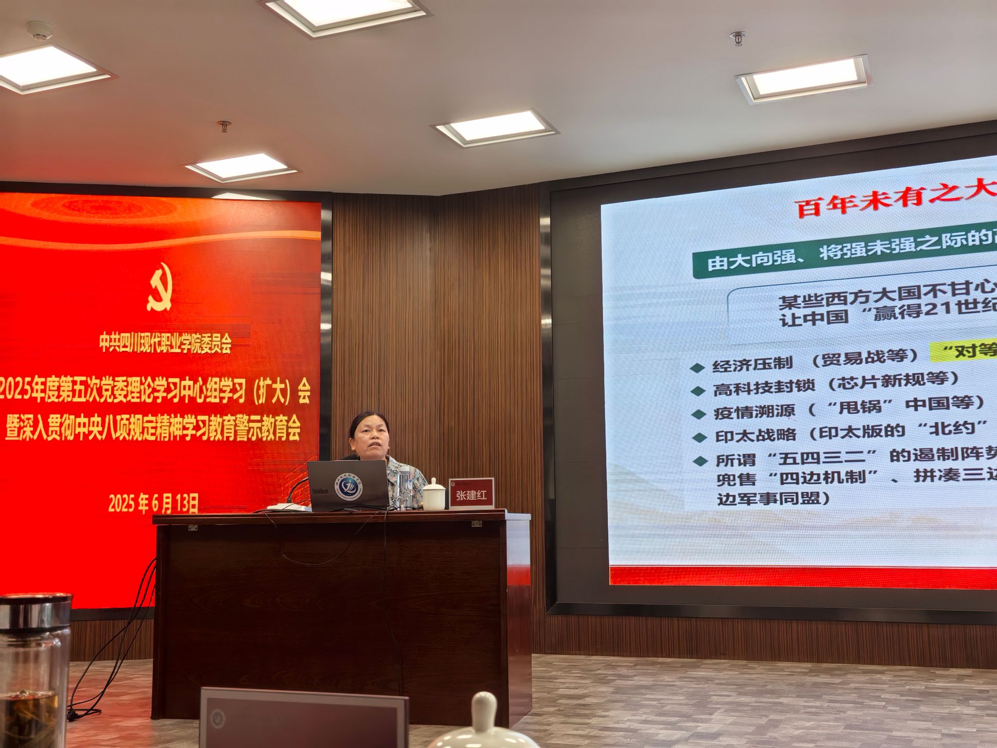 张建红以当前中央党建领导小组公布的违规吃喝典型案例为切入点,系统阐述了全面从严治党,深入贯彻中央八项规定精神学习教育的重要意义,她对中央八项规定精神的有关文件进行了解读,系统论述了违反中央八项规定精神的几大方面,并以大量现实案例现身说法,教育引导大家坚决同违反中央八项规定精神的行为作斗争。张建红的报告既有理论深度,又生动诙谐,同时具有极强的现实意义,受到四川现代职业学院方面的高度赞扬。