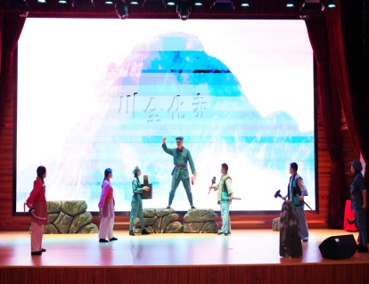 在“成信礼堂”室内活动中,我校党委副书记杨奇才同志,中共通江县委常委、县委宣传部部长赵树文同志分别致辞,表达了对本次活动的热烈祝贺和对未来持续深化合作,系统推动红色史料研究、红色课程开发、红色实践基地共建,共同打造具有辨识度影响力的校地协同思政工作品牌的展望。在出席领导和430余位师生的见证下,马克思主义学院丁小珊院长和红四方面军总指挥部旧址纪念馆庞虎馆长签订了校馆合作协议。随后,庞虎馆长围绕《以青春之我 践时代之诺》主题,深入浅出、形象生动地为师生代表讲解了川陕苏区精神——“智勇坚定、排难创新、团结奋斗、不胜不休”的丰富内涵及其新时代传承路径。红四方面军总指挥部旧址纪念馆工作人员以《石破天惊》为舞台剧名,为师生代表深情演绎了一场感人至深的情景党课。全体学生争先恐后,抢答红色知识问答。最后,在全体师生手握红旗、齐唱《我的祖国》歌声中,室内活动缓缓落下帷幕。